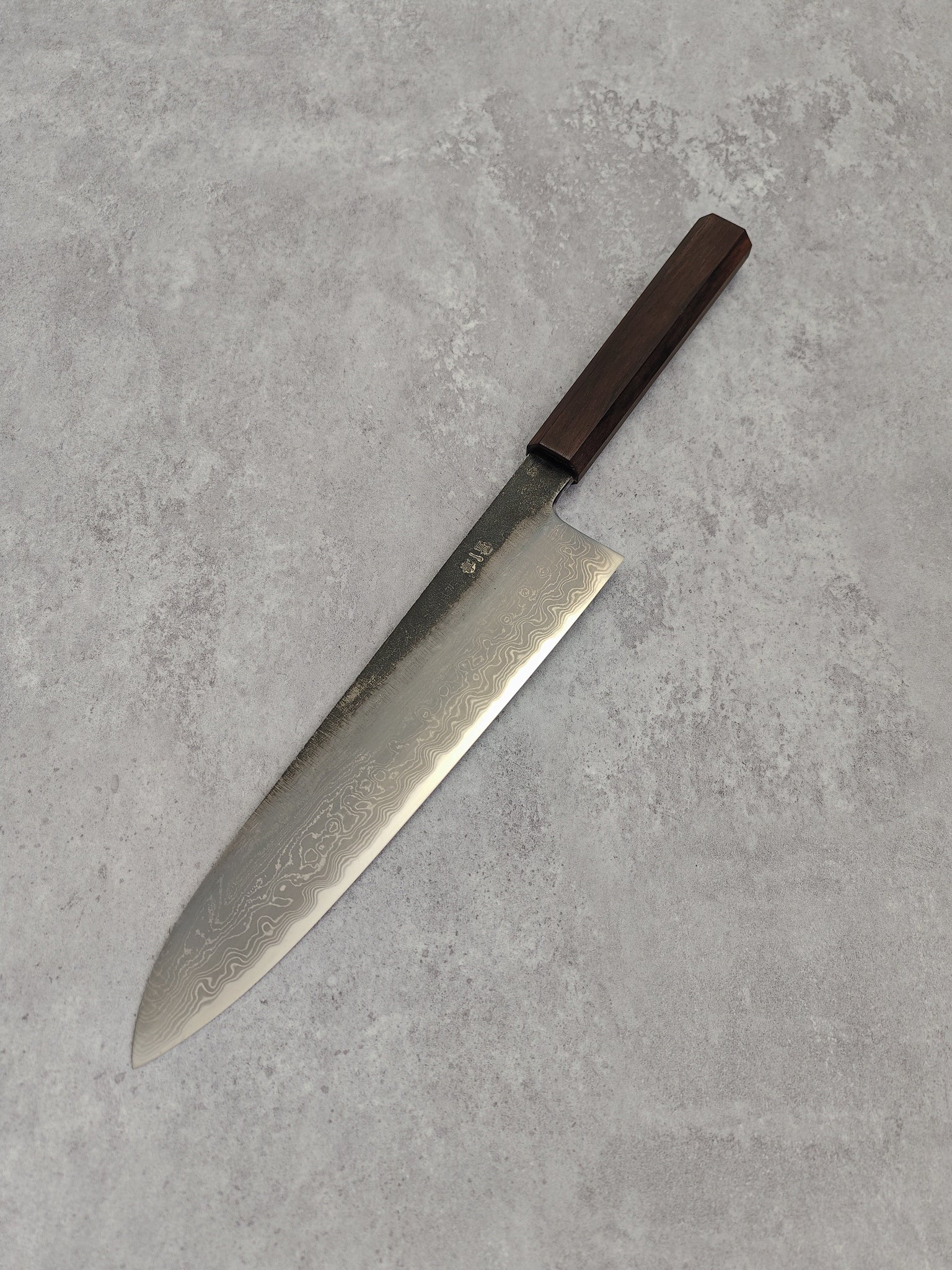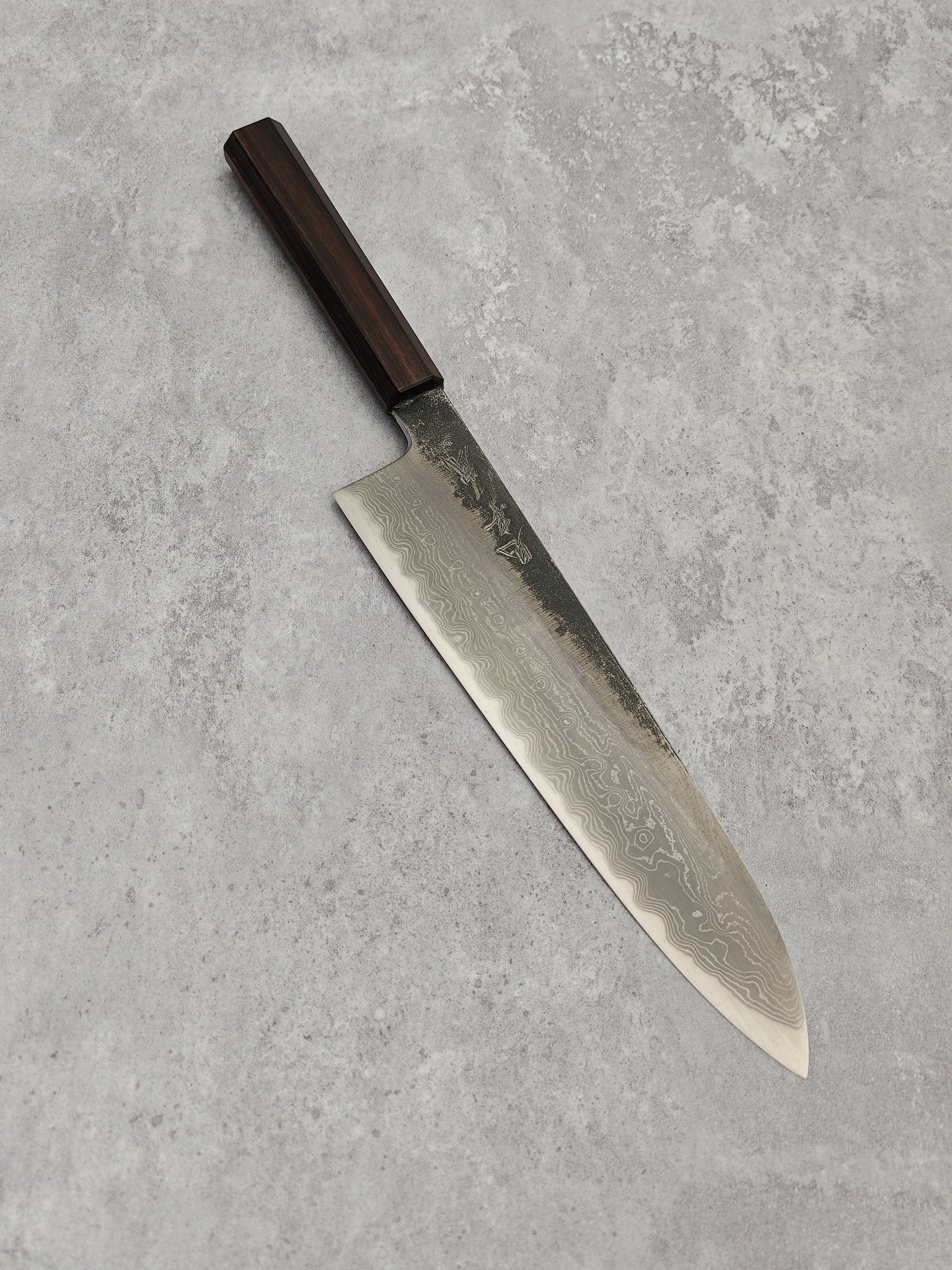 Hitachi Blue #1 core laminated with soft iron damascus, forged by Satoshi Nakagawa.